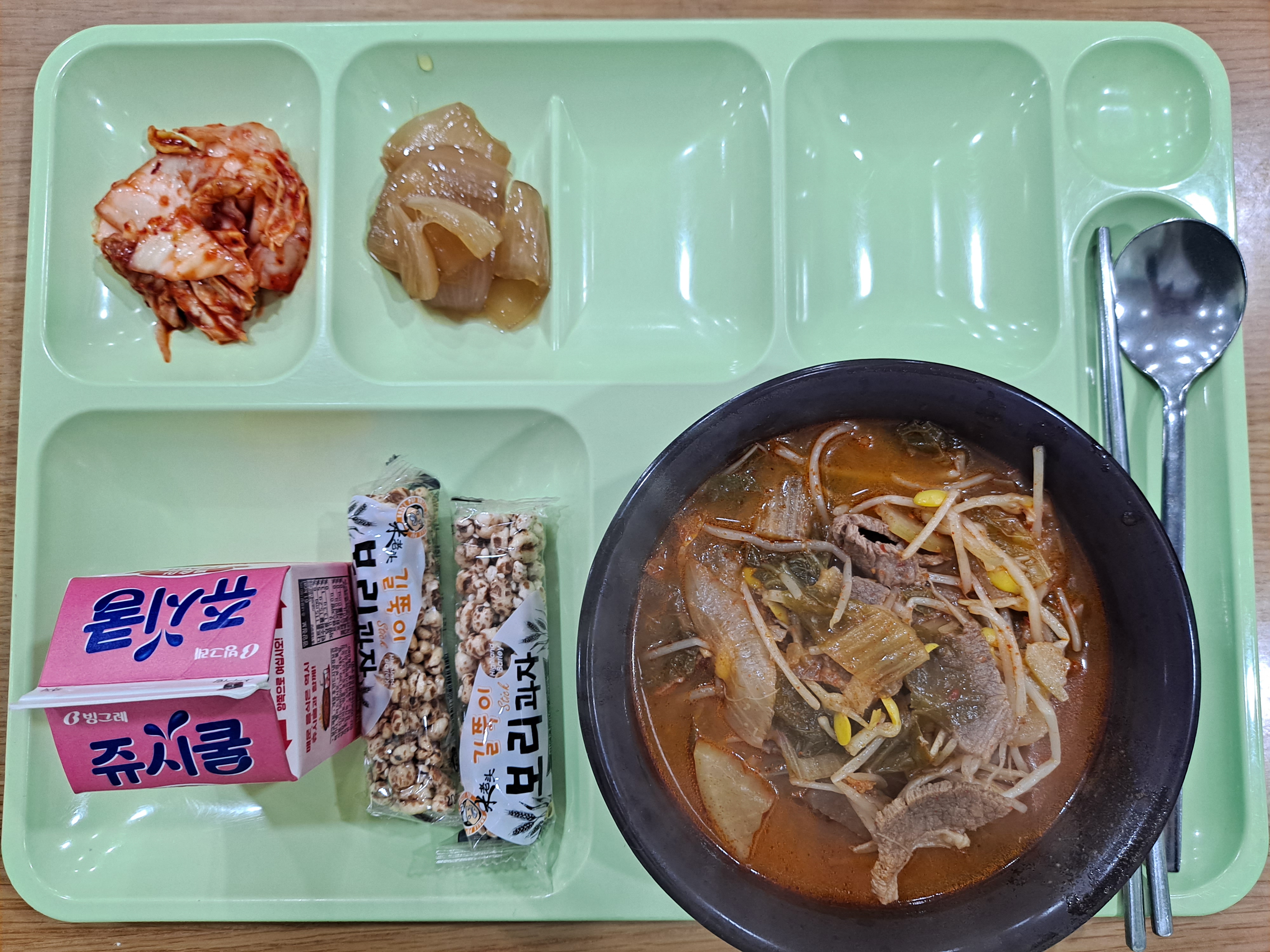 장터국밥, 양파장아찌,배추김치, 보리과자, 쥬시쿨