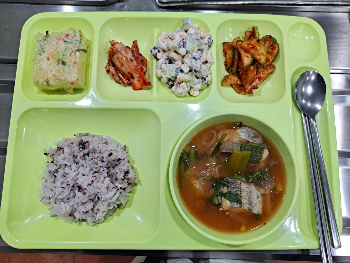 쌀밥 / 얼큰동태탕 / 야채계란찜 / 새콤오이무침 / 마카로니샐러드/ 배추김치