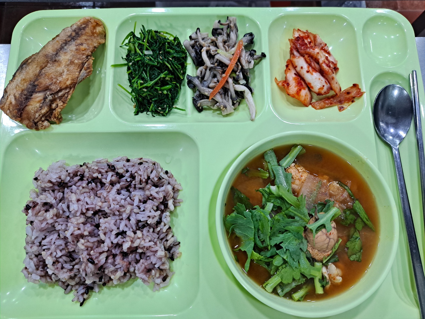 쌀밥 / 얼큰알탕 / 삼치구이 / 느타리버섯볶음 / 세발나물무침 / 배추김치