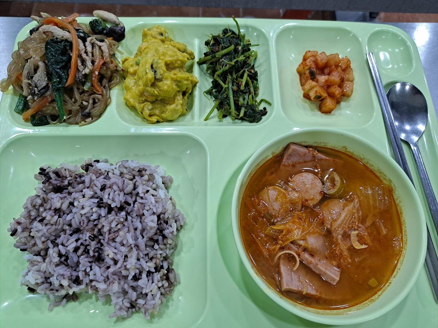 쌀밥 / 부대찌개 / 한식잡채 / 비름나물 / 단호박범벅 / 깍두기