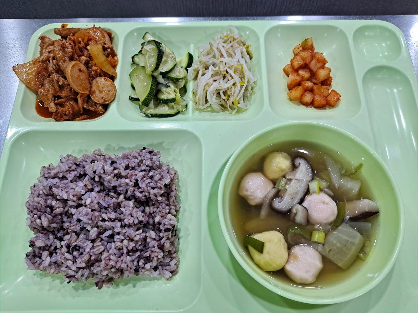 쌀밥 / 완탕 / 부대볶음 / 숙주나물무침 / 호박볶음 / 깍두기
